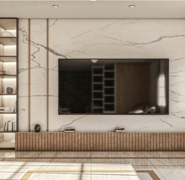 Desain backdrop TV mewah minimalis juga dapat diimplementasikan dengan memanfaatkan cat dinding warna solid yang kontras. Warna gelap seperti navy atau hitam dapat menjadi latar belakang yang menonjolkan TV serta aksesori lainnya, menciptakan focal point yang menarik perhatian. Di samping itu, menambahkan karya seni dinding seperti lukisan atau foto keluarga di sekitar area backdrop dapat memberikan elemen personal dan memperkaya desain keseluruhan.